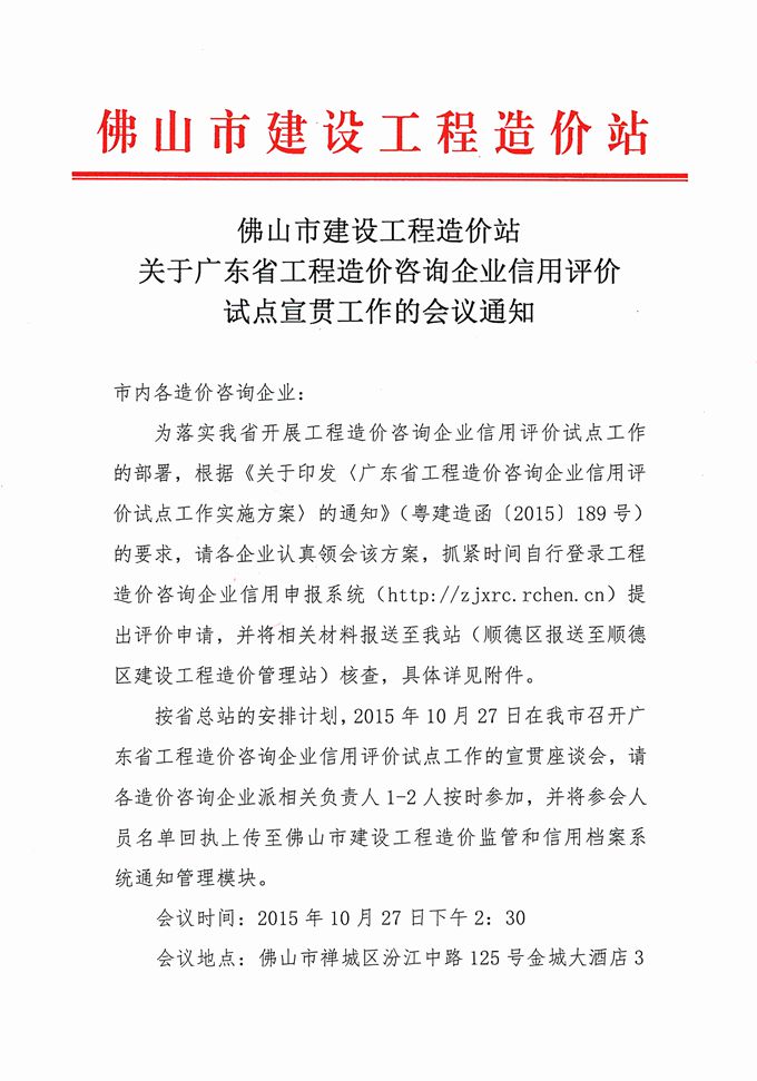 佛山市建設工程造價站關于廣東省工程造價咨詢企業信用評價試點宣貫工作的會議通知