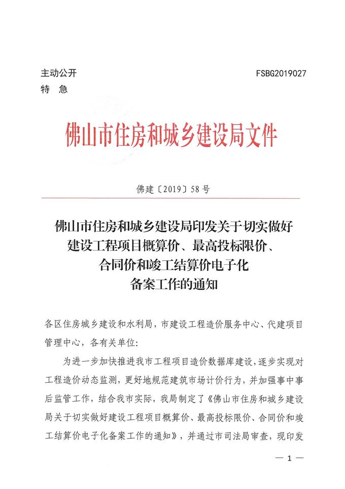 佛山市住房和城鄉建設局印發關于切實做好建設工程項目概算價、最高投標限價、合同價和竣工結算價電子化備案工作的通知