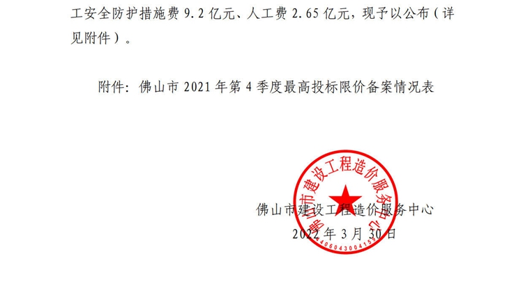 佛山市建設工程造價服務中心關于公開2021年第4季度佛山市最高投標限價備案情況的通知