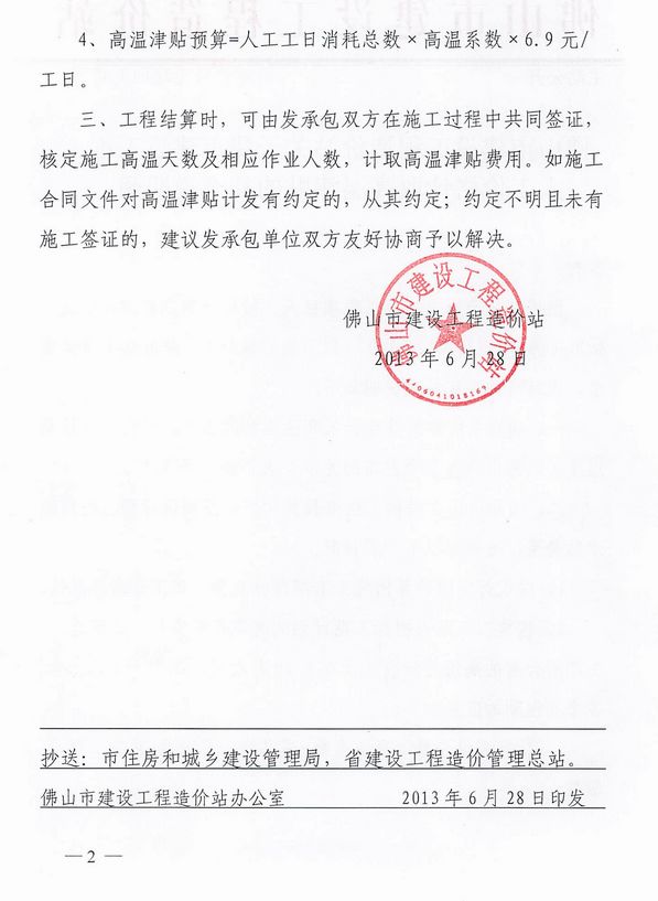 佛山市建設工程造價站關于我市建設工程人工價格計取高溫津貼的補充說明函