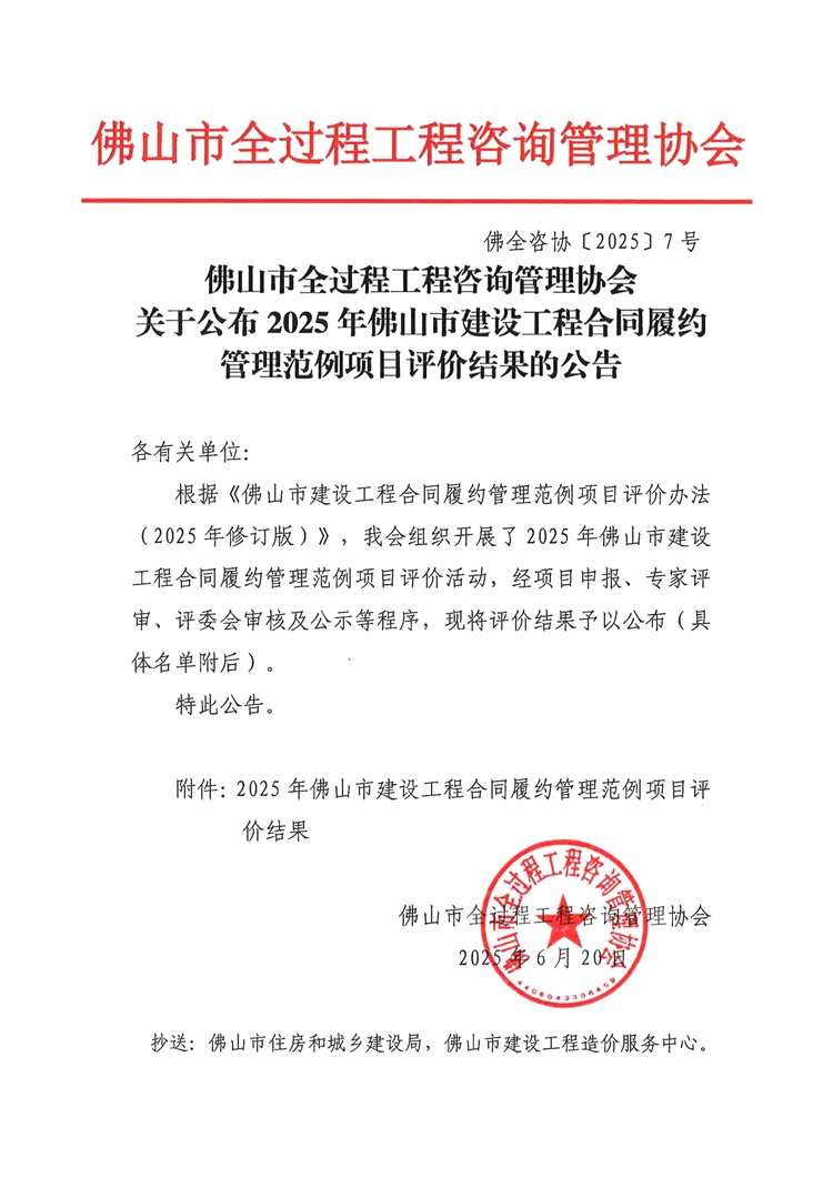 佛山市全過程工程咨詢管理協會關于公布2025年佛山市建設工程合同履約管理范例項目評價結果的公告