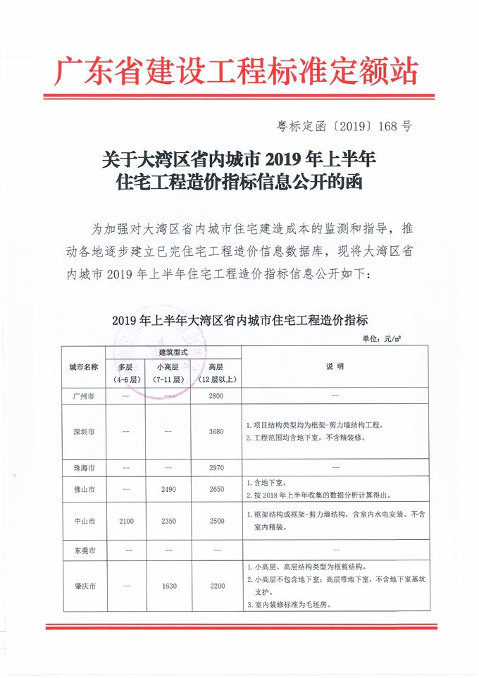 關(guān)于大灣區(qū)省內(nèi)城市2019年上半年住宅工程造價(jià)指 標(biāo)信息公開(kāi)的函